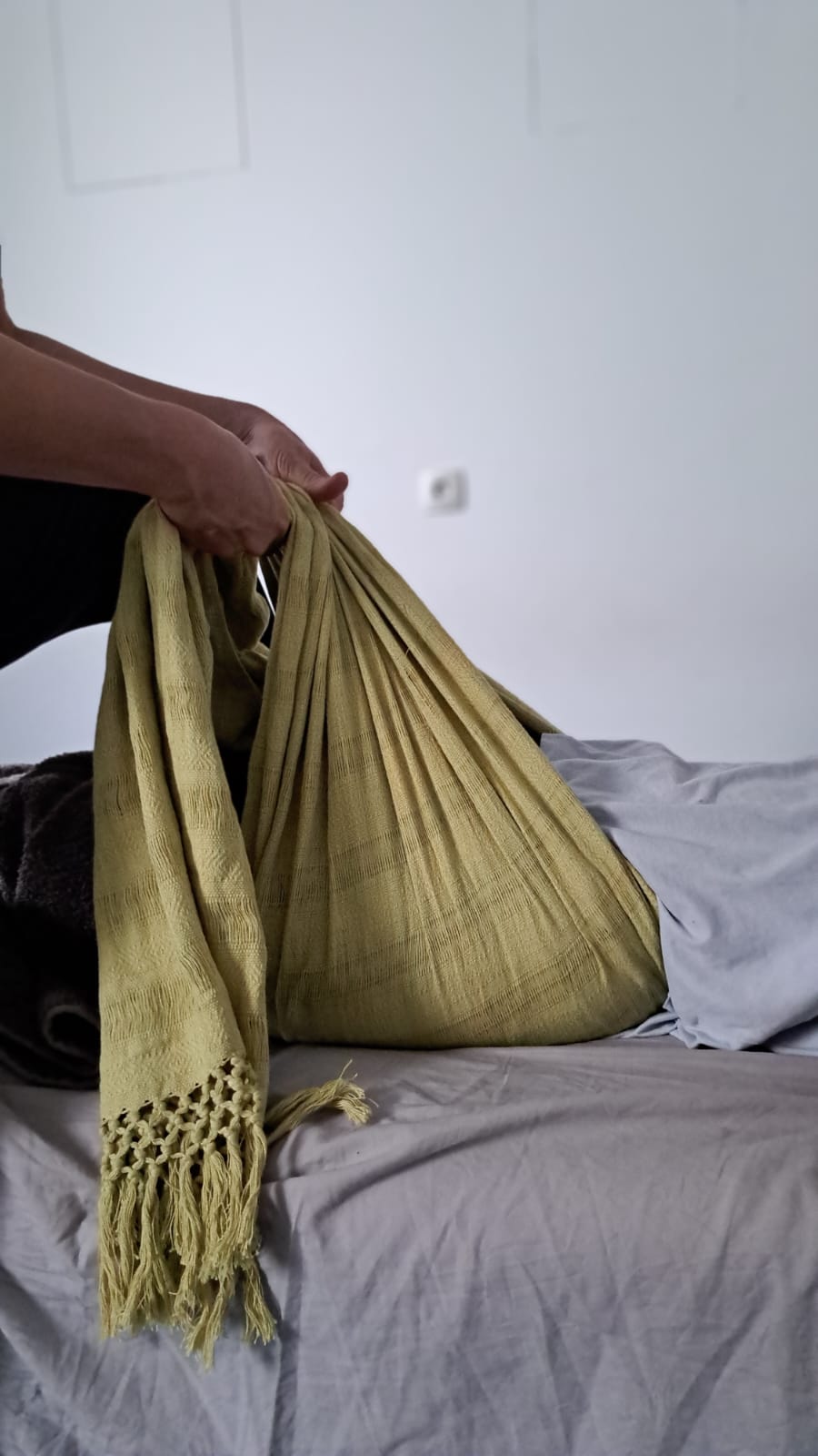 Avant le serrage en lui-même, j’utilise le rebozo pour balancer, bercer, étirer, envelopper ou contenir votre bassin.
